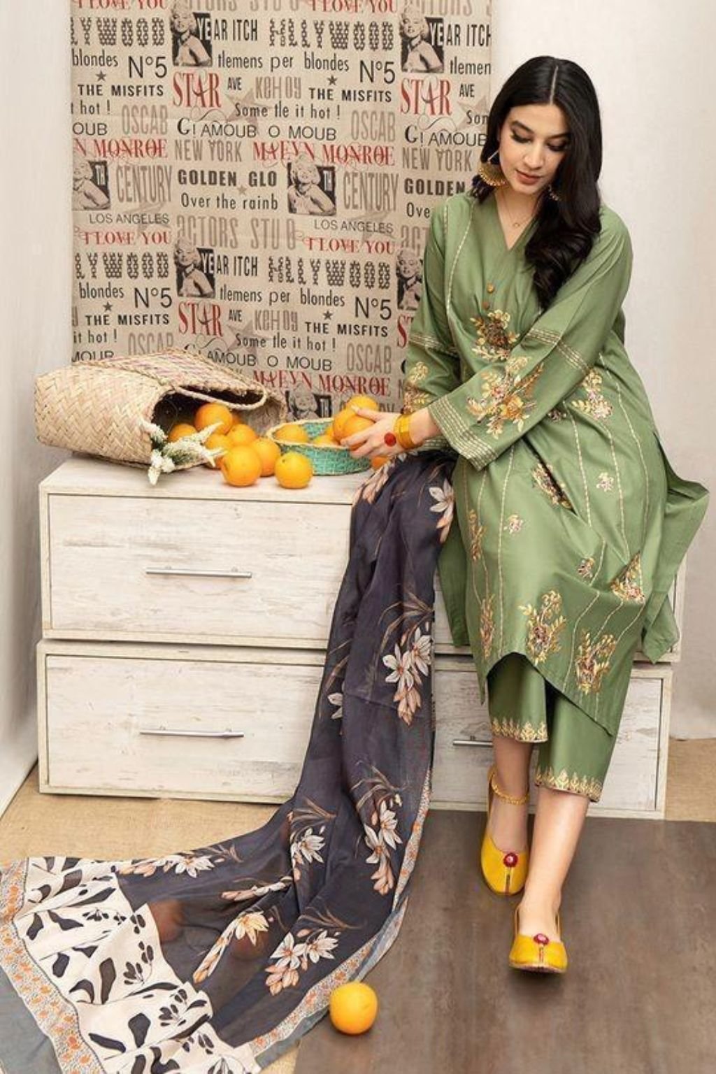 The lawn fabric featured in both the shirt and trouser promises exceptional comfort, lightweight wearability, and breathability, making it suitable for all-day use. Whether attending a social event or simply enjoying a day out, the embroidered patterns add a layer of refinement that stands out from the crowd. The diamond fabric dupatta enhances the ensemble with its subtle printed design, creating a harmonious balance of texture and detail.